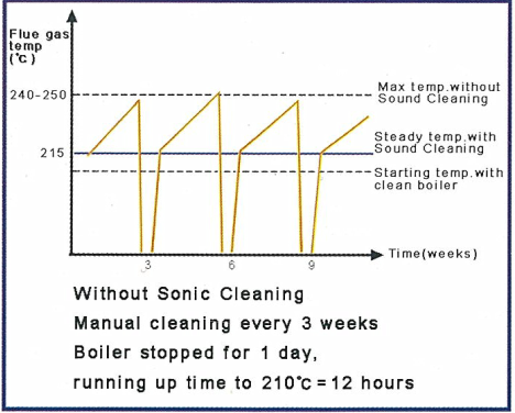 声波清洁的基本原理是,通过产生一个带有一定能量的声波,抵消游浮在气流中灰垢的聚集力或表面粘附力,以阻止其相互之间结合成一硬壳层。