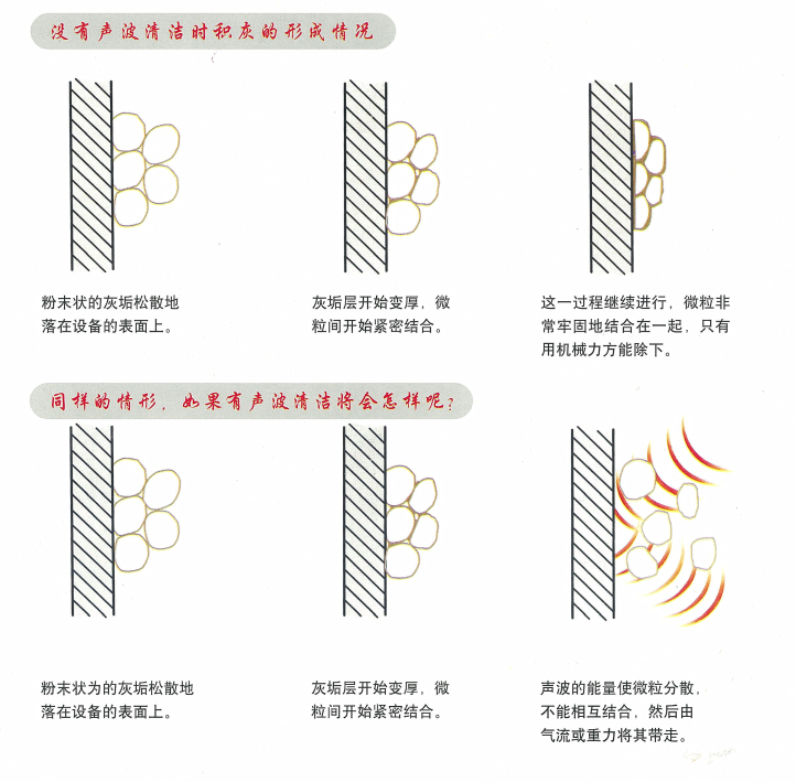 声波清洁的基本原理是,通过产生一个带有一定能量的声波,抵消游浮在气流中灰垢的聚集力或表面粘附力,以阻止其相互之间结合成一硬壳层